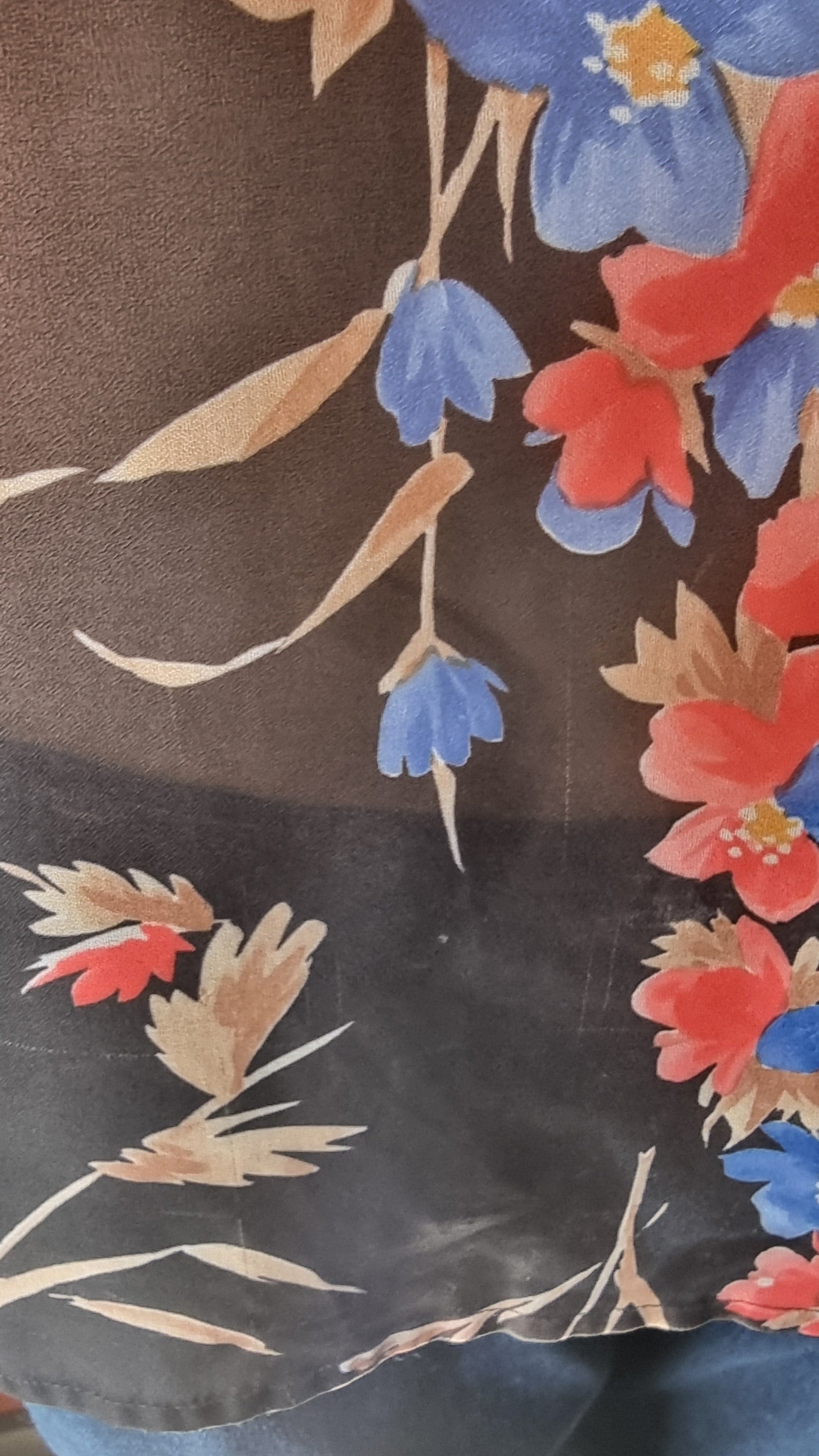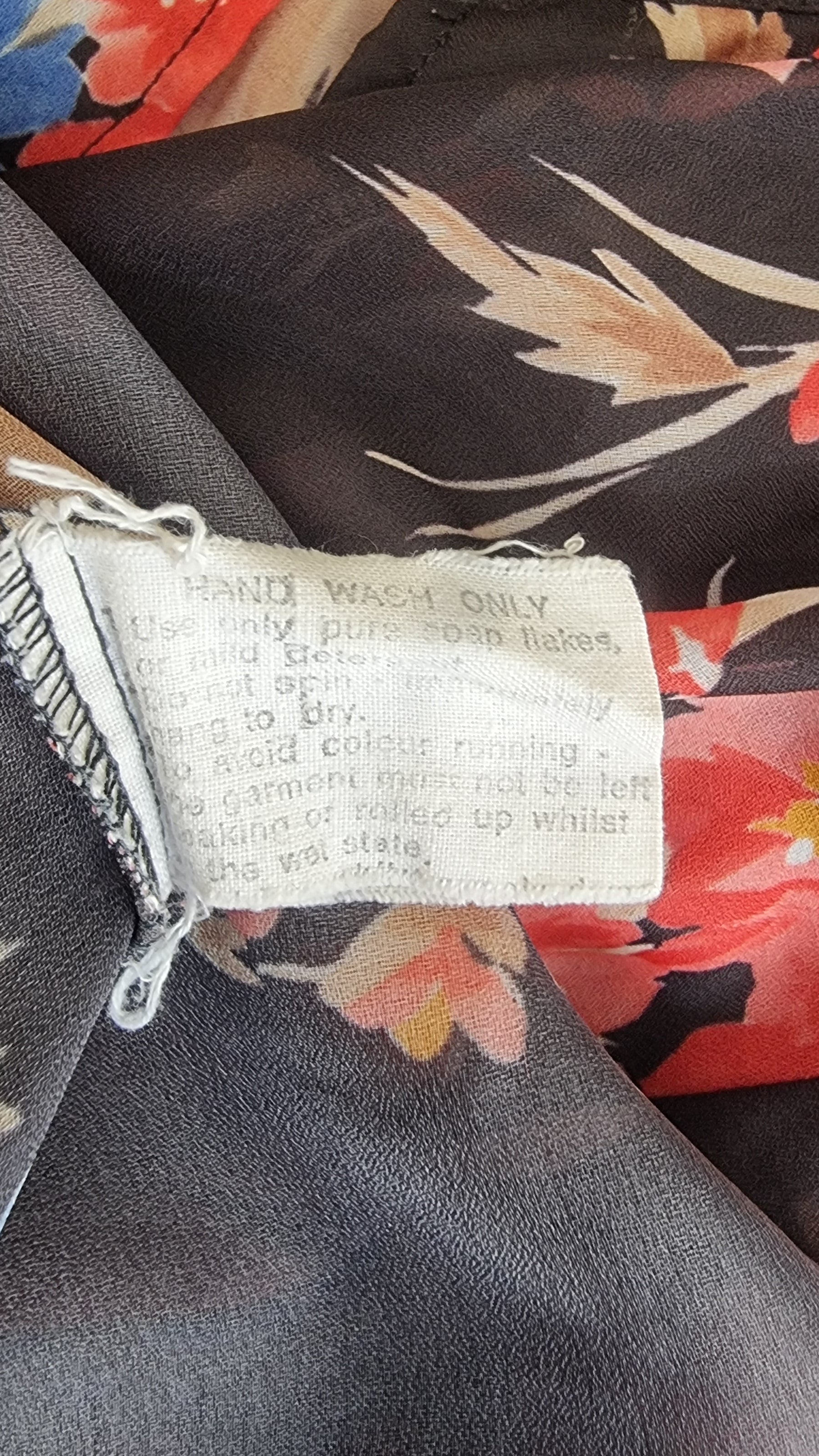 Vintage black floral blouse by Elsie Whiteley. Sheer fabric, there are pulls due to wear and tear. Modern size 6-8.