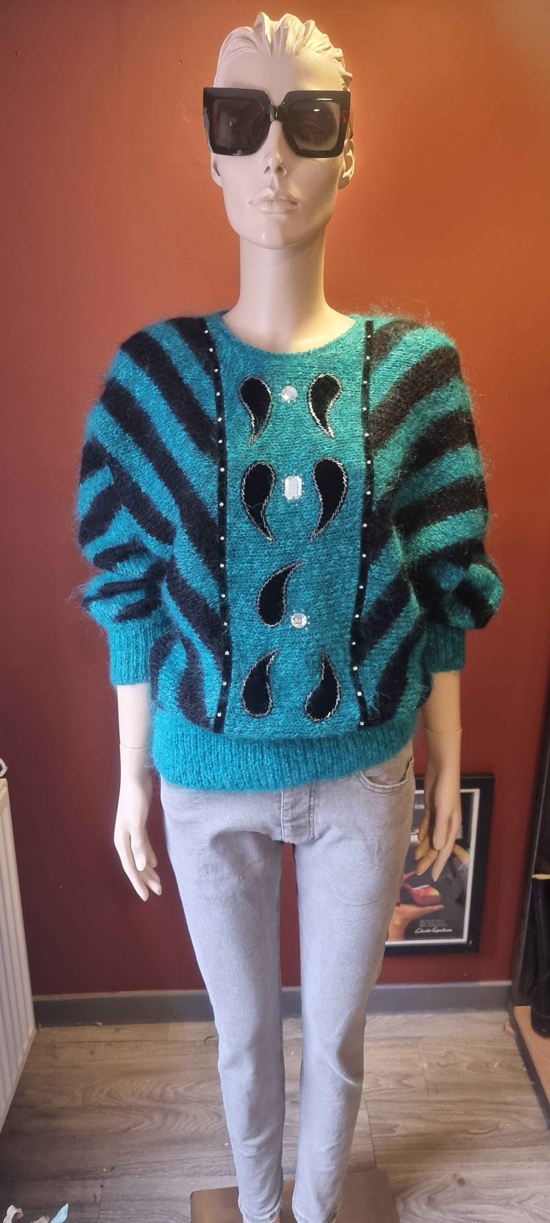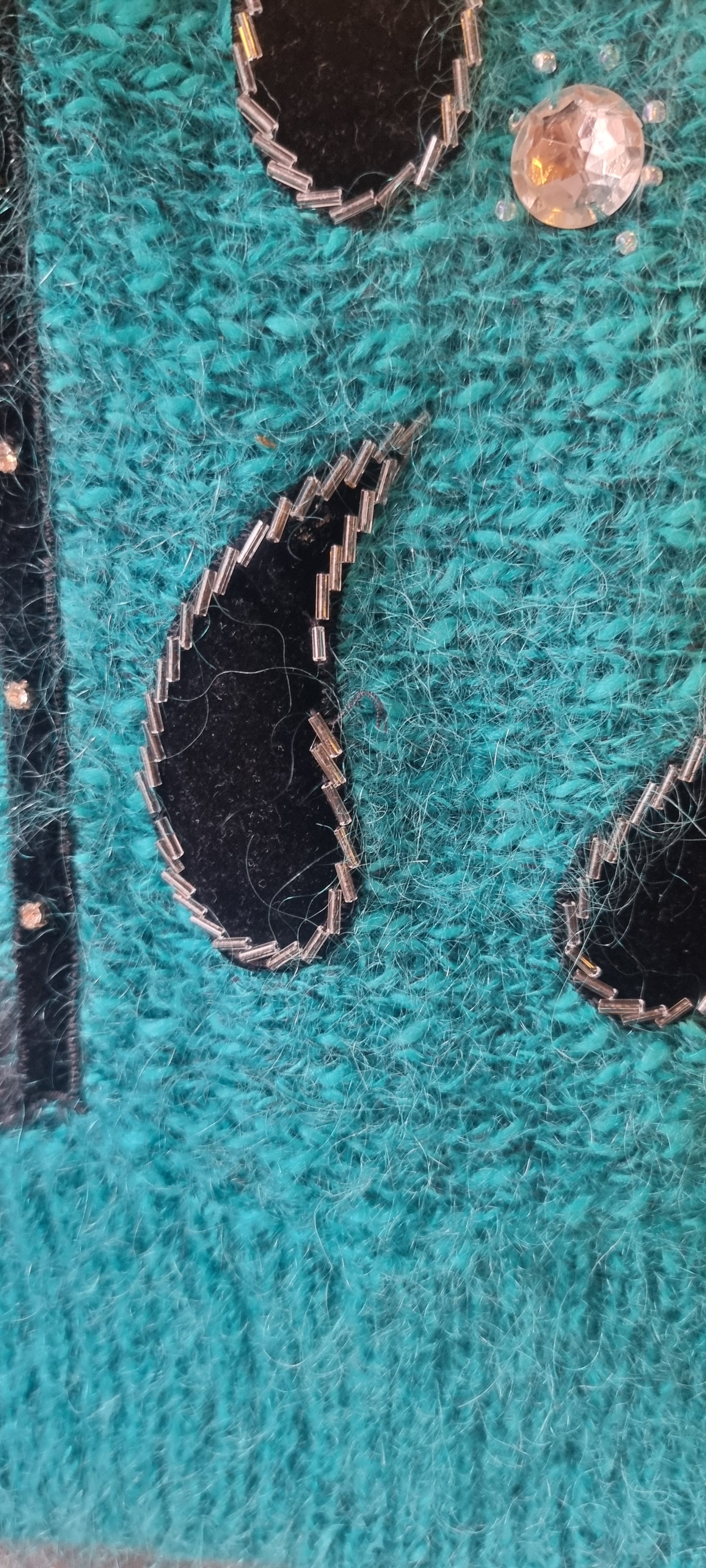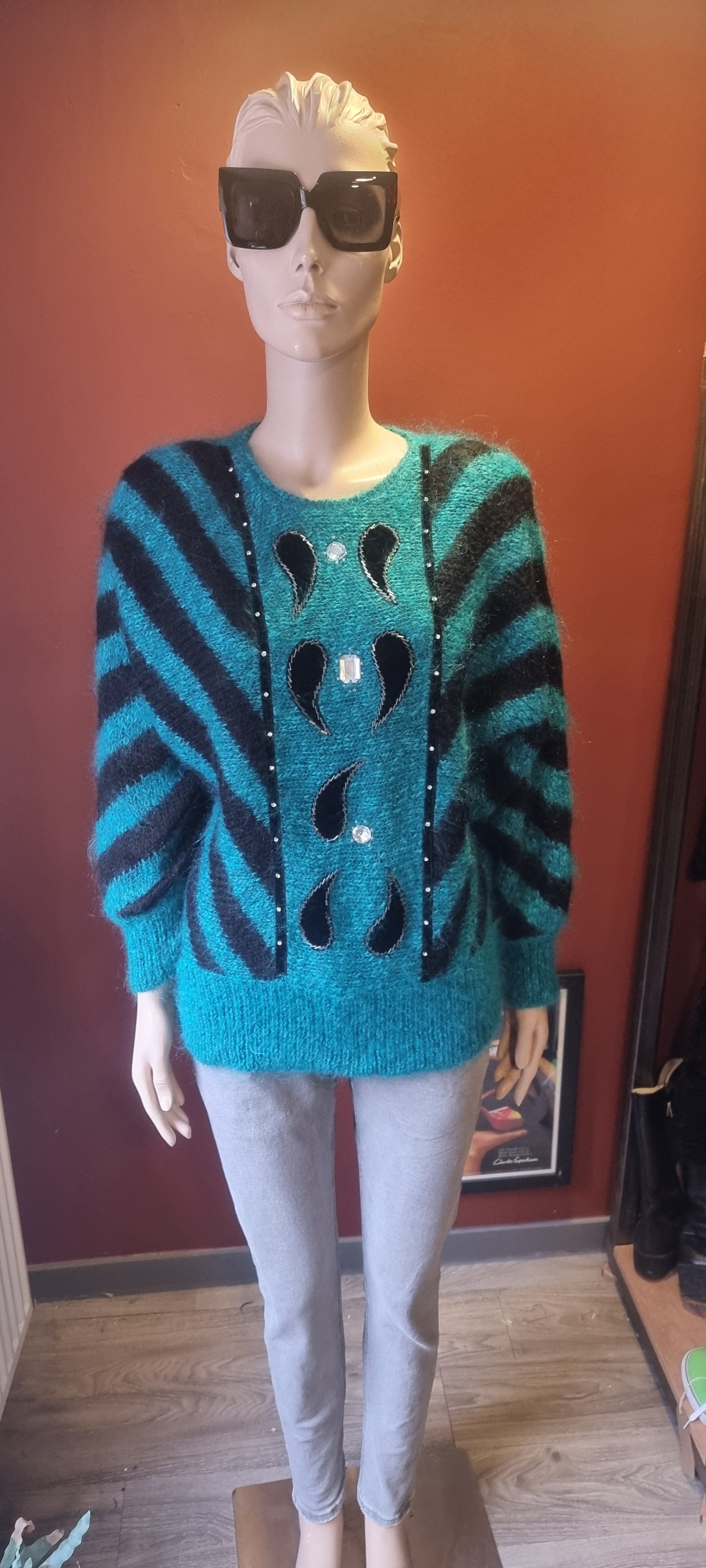1980s vintage mohair jumper in teal. With a black striped pattern and beaded paisley appliques. Shoulder pads for added shape. Size S/M. Check pictures for missing beads.